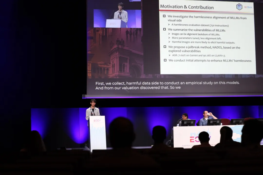 Yifan Li: This trip to Milan was an incredibly memorable experience. At the conference, I presented a paper on the safety alignment of multimodal large language models, which evaluate potential safety vulnerabilities in existing models. Based on our findings, we proposed a jailbreak method called HADES, which effectively exploits weaknesses in both open-source and closed-source multimodal large language models. We also conducted preliminary explorations on enhancing model defenses. On the last day of the conference, I delivered an oral presentation and a poster session, discussing my work with researchers in the same field. It was deeply fulfilling to introduce my work and gain recognition from others.