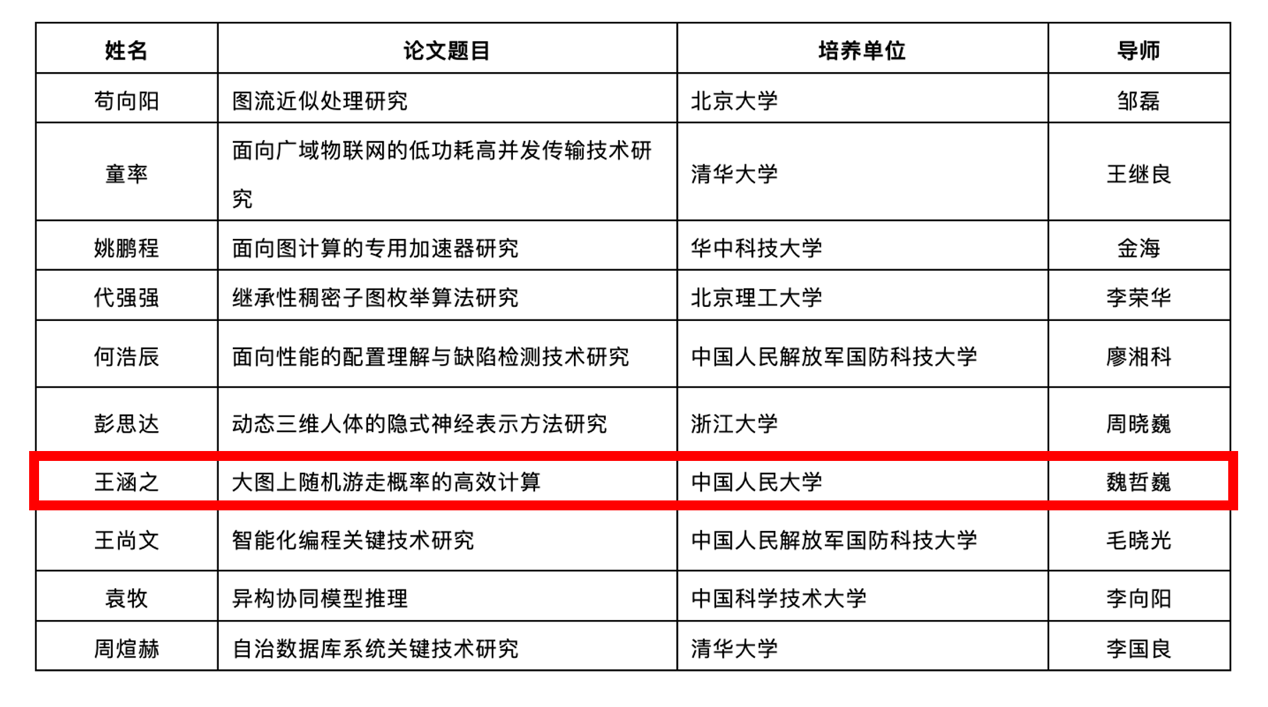 Hanzhi Wang, a PhD student supervised by Professor Zhewei Wei from Gaoling School of Artificial Intelligence at Renmin University of China, was recently awarded the 2024 China Computer Federation (CCF) Outstanding Doctoral Dissertation Award. This award is the most prestigious recognition for computer science PhD students in China and is given to only ten students nationwide each year. The selection is based on the technical depth and significance of each candidate’s doctoral dissertation. Prior to Hanzhi, PhD student Yulei Niu, supervised by Professors Ji-Rong Wen and Zhiwu Lu from Gaoling School of Artificial Intelligence, has won the award in 2021.