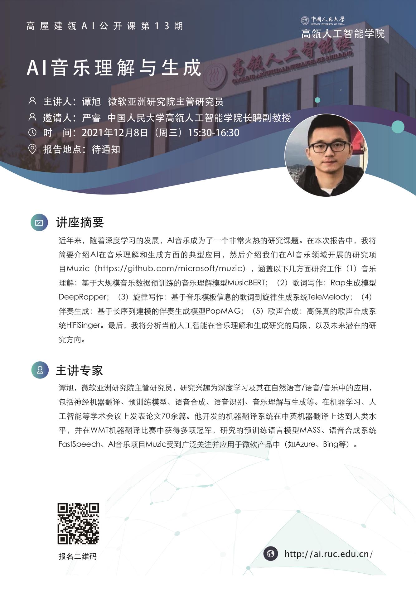 近年来,随着深度学习的发展,AI音乐成为了一个非常火热的研究课题。在本次报告中,我将简要介绍AI在音乐理解和生成方面的典型应用,然后介绍我们在AI音乐领域开展的研究项目Muzic(//github.com/microsoft/muzic),涵盖以下几方面研究工作(1)音乐理解:基于大规模音乐数据预训练的音乐理解模型MusicBERT;(2)歌词写作:Rap生成模型DeepRapper;(3)旋律写作:基于音乐模板信息的歌词到旋律生成系统TeleMelody;(4)伴奏生成:基于长序列建模的伴奏生成模型PopMAG;(5)歌声合成:高保真的歌声合成系统HiFiSinger。最后,我将分析当前人工智能在音乐理解和生成研究的局限,以及未来潜在的研究方向。