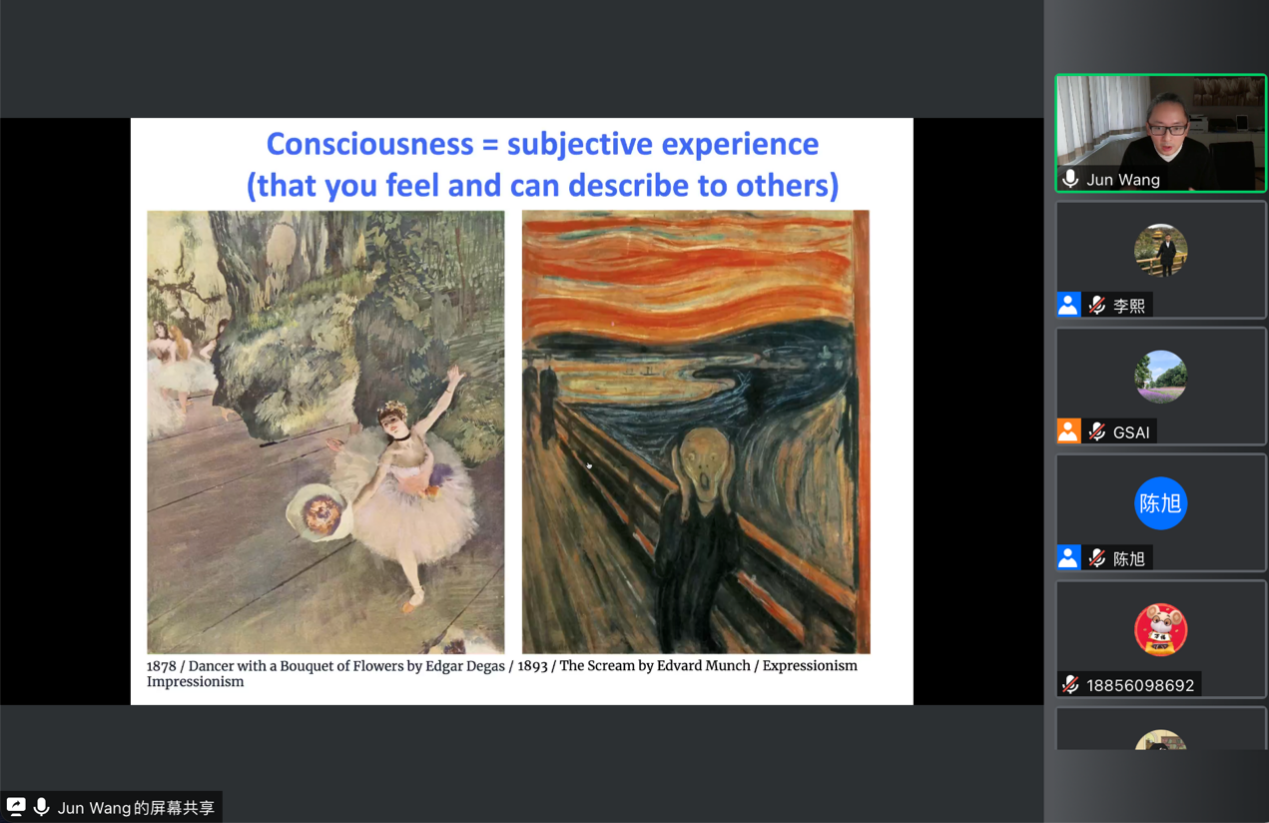 讲座第二部分,汪教授介绍了决策和强化学习的最新发展。包括多智能体强化学习如何model一个population的行为,以及“Mirror-test”和笛卡尔对Human-mind的思考,引出意识这一概念——意识是主观感受,感觉到并可以描述给其他人,并介绍了研究意识产生的Blindsight测试。汪教授指出,如何利用这些理论辅助设计神经网络是一个新的研究方向。