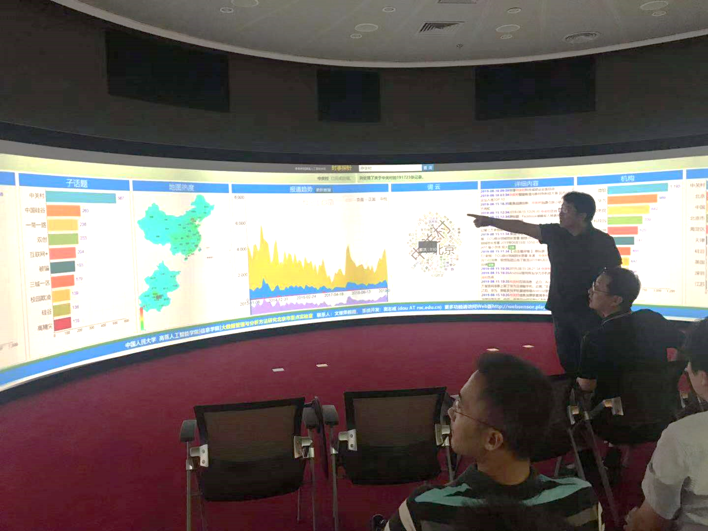 随后,文继荣教授运用240度立体无缝环幕系统向刘航一行演示了“时事探针”实时舆情分析系统和网络扶贫行动大数据分析平台等团队科研成果,直观展现出自然语言处理、多维分析等大数据技术对科学决策的有力支撑。