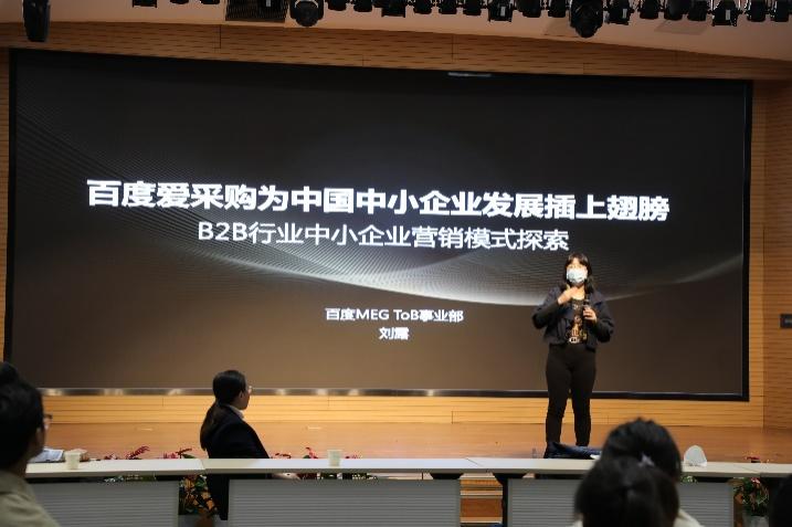 众人首先来到位于科技园6号楼的熊掌报告厅,聆听人民大学信息学院99级校友、百度MEG ToB事业部刘露老师关于“B2B行业中小企业营销模式探究“的报告。