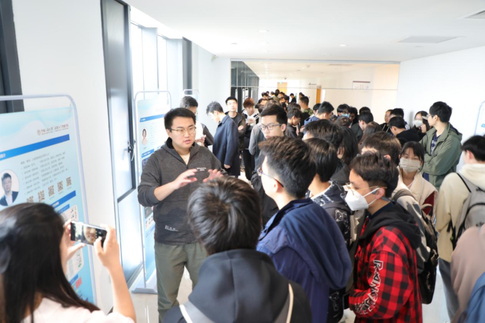 “AI学术市集”Poster展板陈列在高瓴人工智能楼走廊,展示了学院各位老师的学术背景、研究方向与研究内容,方便参与者直观地了解教师的各个研究领域。参与活动的人大学子畅所欲言,提出他们对于人工智能的看法和感悟,交流学习经验和心得,与同学们共同探讨专业学习、道路选择上的相关问题,氛围轻松愉快。