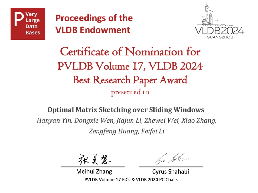 8月29日,数据管理与数据库领域国际学术会议VLDB 2024公布了论文获奖名单,威尼斯人娱乐场官方网站 魏哲巍教授、张骁助理教授与复旦大学黄增峰教授、阿里巴巴集团李飞飞博士合作的论文“Optimal Matrix Sketching over Sliding Windows”获得了最佳论文提名奖(Best Research Paper Nominations)。魏哲巍教授担任本文通讯作者,其与张骁助理教授指导的硕士生尹涵燕、博士生文东勰和李家郡为学生作者。VLDB(International Conference on Very Large Data Bases)会议是数据管理与数据库领域的三大国际顶尖学术会议之一,被中国计算机学会(CCF)推荐为A类国际会议。VLDB 2024会议于2024年8月26-30日在广州召开。