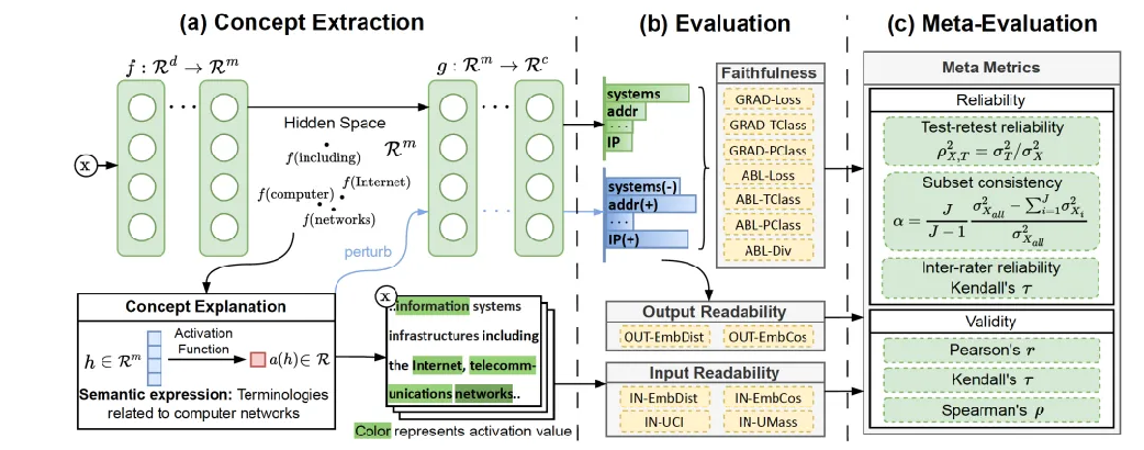 论文概述:尽管大型语言模型展示出了令人惊讶的高智能,但由于其黑箱特性,人们仍对其在实际应用中的部署存有顾虑。基于概念的解释可以抽取大模型学习到的高层次的模式,对模型行为进行解释,因而近来受到了广泛的关注。然而,目前对概念解释的评估往往是启发式的和非确定性的,例如案例研究或人工评估,这阻碍了该领域的发展。为弥合这一差距,本文通过忠实性和可读性来评估概念解释。本文首先引入一个适用于各种概念解释的形式化定义。在此基础上,通过扰动和移除概念的影响,来量化一个概念解释的忠实性。为了确保在高维空间中对不同概念进行充分的扰动,本文通过优化问题来表示并求解扰动程度。进一步,本文提供了一种自动测量概念解释可读性的方法,测量最大程度激活一个概念的模式的连贯性。这种测量方法可作为人工评估的平价且可靠的替代方案。最后,本文描述了一个基于测度论的元评估方法,从可靠性和有效性两方面对提出的评测指标进行审查和比较,为指标的选择提供一定的指引。基于元评估方法得到的实验结果,过滤掉了4个不可靠的指标,并验证了其余指标的有效性。