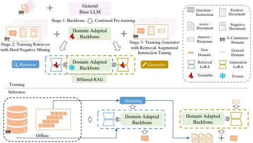 检索增强生成(Retrieval Augmented Generation, RAG)系统在电商等领域非常重要,这些领域中存在大量长尾实体且信息更新频繁。大多数现有的工作采用检索和生成的独立模块,这可能并非最优方案,因为检索任务和生成任务无法相互受益以提升性能。我们提出了一种新的共享基座参数的RAG框架(BSharedRAG)。该框架首先使用领域特定的语料库对基础模型进行持续预训练,作为领域特定的基座模型,然后基于共享的基座模型训练两个即插即用的低秩适应(LoRA)模块,分别最小化检索和生成的损失。实验结果表明,我们提出的BSharedRAG在两个数据集的检索评估中相较基线模型分别提升了5%和13%的Hit@3表现,并在生成评估中BLEU-3指标上提升了23%。