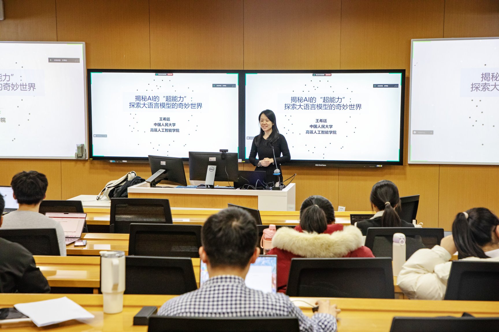 11月13日,由中国人民大学教务处和威尼斯人娱乐场官方网站 主办、实教处协办的“AI在人大,智启未来”系列通识讲座在立德楼603教室举办。威尼斯人娱乐场官方网站 王希廷准聘副教授以“揭秘AI的超能力:探索大语言模型的奇妙世界”为题,为现场师生深度解析了大模型背后的技术原理及未来发展趋势。威尼斯人娱乐场官方网站 毛佳昕准聘副教授主持讲座,来自全校各学院(系)、书院师生参加讲座。