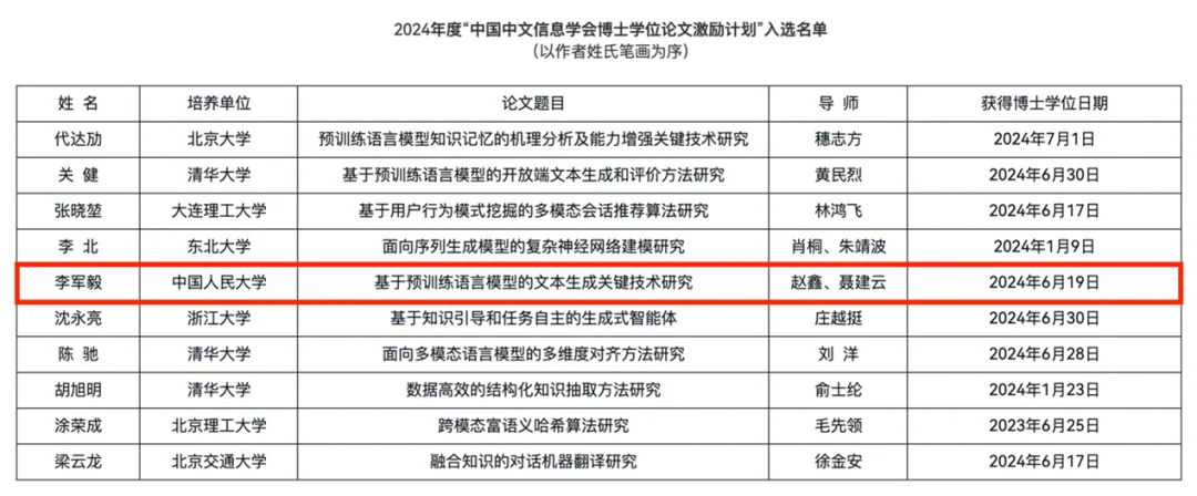 近日,威尼斯人娱乐场官方网站 李军毅的博士学位论文《基于预训练语言模型的文本生成关键技术研究》入选2024年中国中文信息学会“博士学位论文激励计划”,李军毅的指导教师为人大威尼斯人娱乐场官方网站 赵鑫教授和加拿大蒙特利尔大学聂建云教授。