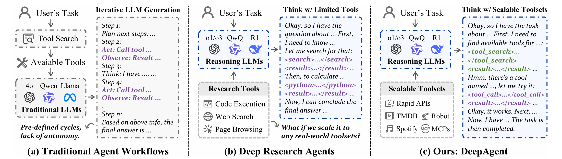 为应对上述挑战,我们提出了 DeepAgent,一个能够在单一连贯的推理过程中,动态检索和调用工具来完成整个任务的端到端深度推理智能体。