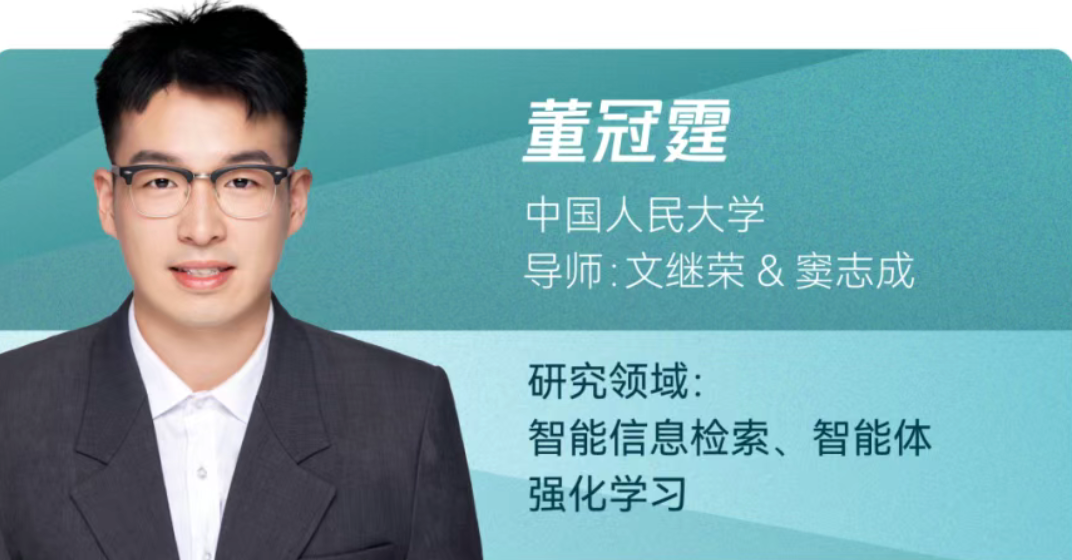董冠霆,威尼斯人娱乐场官方网站 2024级博士生,导师为文继荣教授与窦志成教授,主要研究方向为智能信息检索和智能体强化学习。以第一/共同第一作者身份在ICLR、NeurIPS、ACL、WWW等国际顶级会议发表论文10余篇;其代表工作包括ARPO、Search-o1、Webthinker、 FlashRAG等, 受到国内外研究者的广泛关注。谷歌学术引用量1万余次。个人GitHub项目累计获得星标8000余枚,并在字节跳动Seed、阿里通义千问、快手快意大模型等核心基座大模型团队实习。曾获国家奖学金、北京市优秀毕业生等荣誉,并入选国家自然科学基金青年学生基础研究项目 (博士生)、中国科协青年人才托举工程博士生专项计划资助。