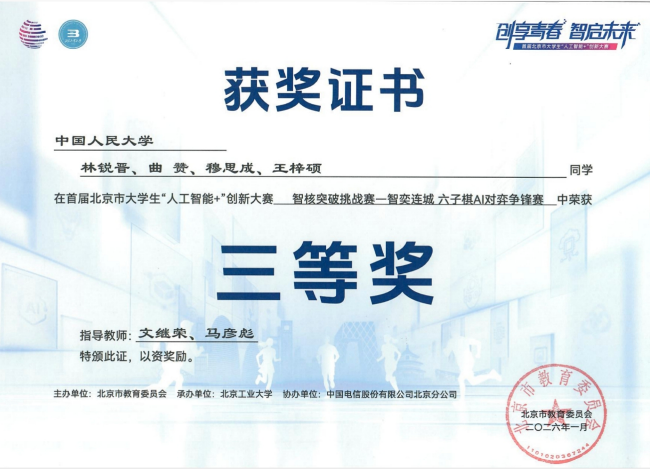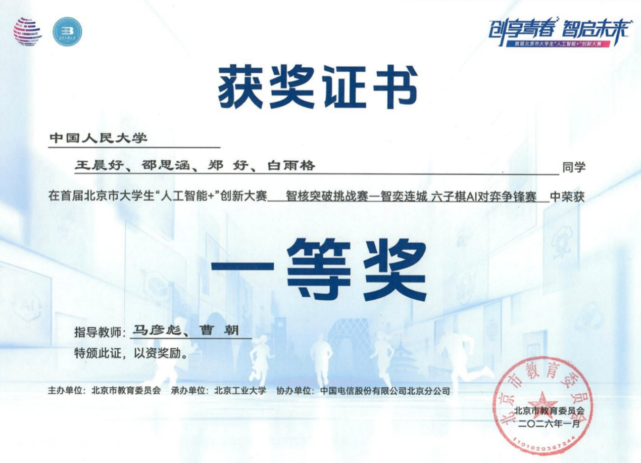 近日,北京市大学生“人工智能+”创新大赛参赛获奖结果公布,威尼斯人娱乐场官方网站 2025级本科生(大一)组建的两支队伍,在学院文继荣院长、曹朝教授、马彦彪老师和两位研究生的指导下,凭借扎实的专业功底和出色的算法设计,从众多高校参赛队伍中脱颖而出,分别斩获北京市大学生“人工智能+”创新大赛的六子棋项目赛道一等奖和三等奖。其中,由王晨好、白雨格、郑好、邵思涵组成的“请输入文本”队获得一等奖,由林锐晋、王梓硕、穆思成(金融数学专业)、曲赞组成的“咪咪”队获得三等奖。