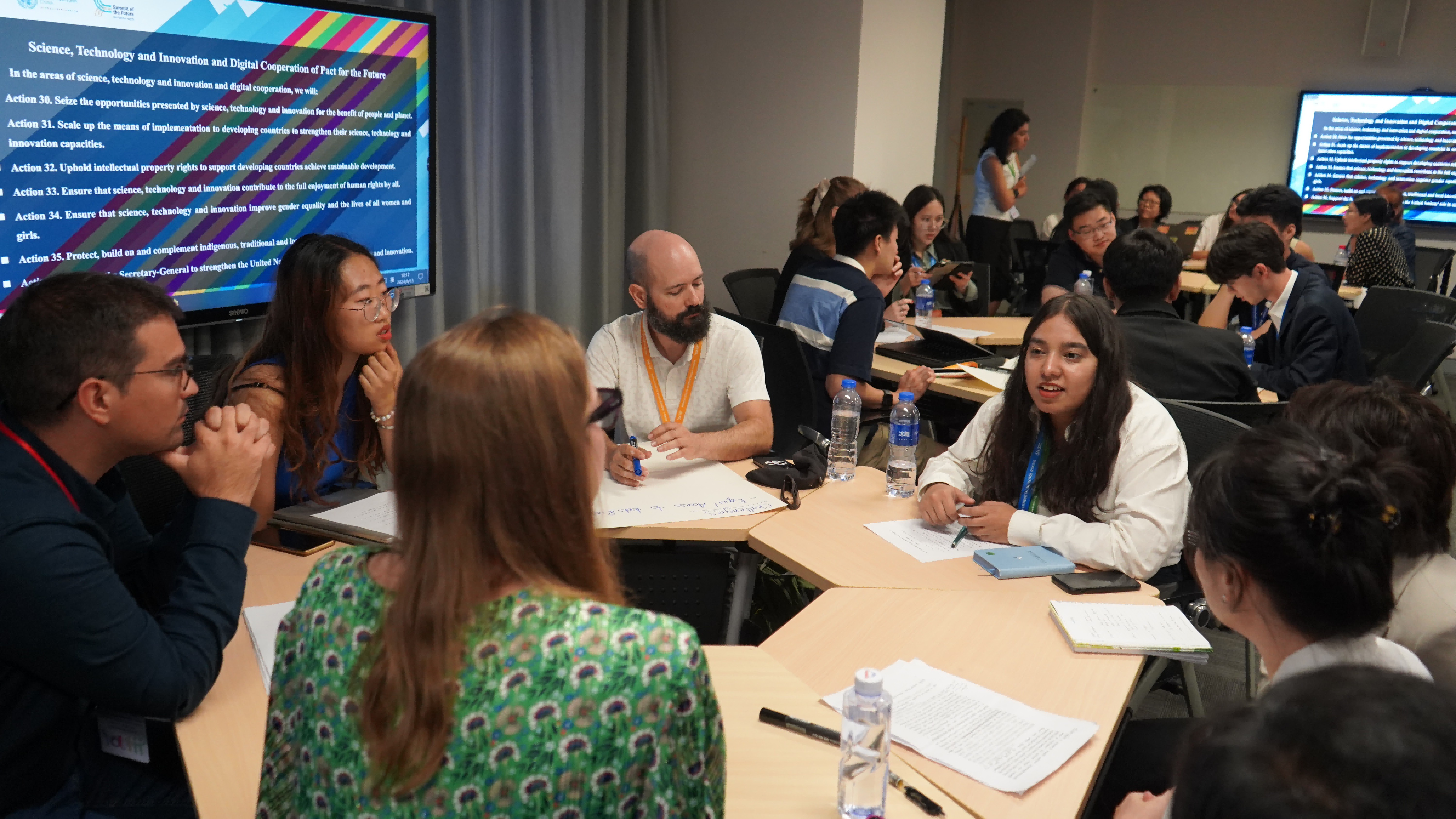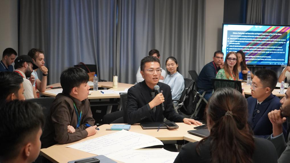 圆桌会设八个平行会场,平行会场由中国人民大学青年教师和联合国驻华机构青年代表共同主持,专家学者进行引导性发言,各国青年代表围绕“可持续发展和发展筹资”“国际和平与安全”“科技创新与数字合作”“青年和子孙后代”“全球治理变革”5个议题进行了分组研讨。其中“科技创新与数字合作”议题由威尼斯人娱乐场官方网站 长聘副教授严睿主持,2021级博士生李书琪、2022级本科生艾坤作为会议速记员参与青年圆桌会。