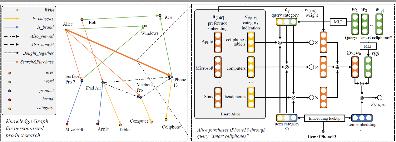 论文概述:现有的个性化产品搜索往往将用户兴趣建模为单个向量,忽略了用户在不同产品类别上可能存在不同偏好的问题。为了解决这个问题,本文提出了一个基于KG的多兴趣模型来建模用户偏好。该多兴趣模型除了建模了用户的兴趣向量之外,也刻画了每个兴趣向量对应的产品类别分布情况,通过基于查询和产品的注意力机制,集成多维兴趣对产品进行打分。同时在模型训练时,我们引入了一个多样化损失项,防止建模的同一用户的不同兴趣出现同质化现象。实验结果证明,我们提出的模型相比现有模型有明显的效果提升。