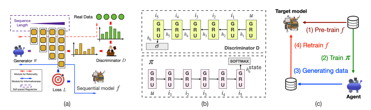 论文概述:序列化推荐系统最近越来越受到学术界和工业界的关注。以往的模型大多通过设计不同的神经模型,引入不同的诱导偏差来拟合训练数据。然而,在实践中,推荐数据可能非常稀疏,尤其是对于用户的顺序行为,这使得学习可靠的模型非常困难。为了解决这个问题,本文提出了一种新的基于生成序列的推荐框架。论文核心思想是生成额外的样本以补充原始训练数据。为了产生高质量的样本,我们考虑两个方面:(1)用户行为序列的合理性(2)训练目标模型的信息量。为了满足这些要求,我们设计了一个双对抗网络。第一个对抗性模块旨在使生成的样本符合真实用户顺序偏好。第二个对抗性模块旨在生成使得模型损失值较大的样本。在我们的模型中,样本是基于强化学习策略生成的,其中奖励的设计基于上述两个要求。为了使训练过程稳定,我们引入了一种self-paced正则化项,以一种简单到困难的方式学习agent。我们在真实数据集上进行了大量实验,证明了我们模型的有效性。