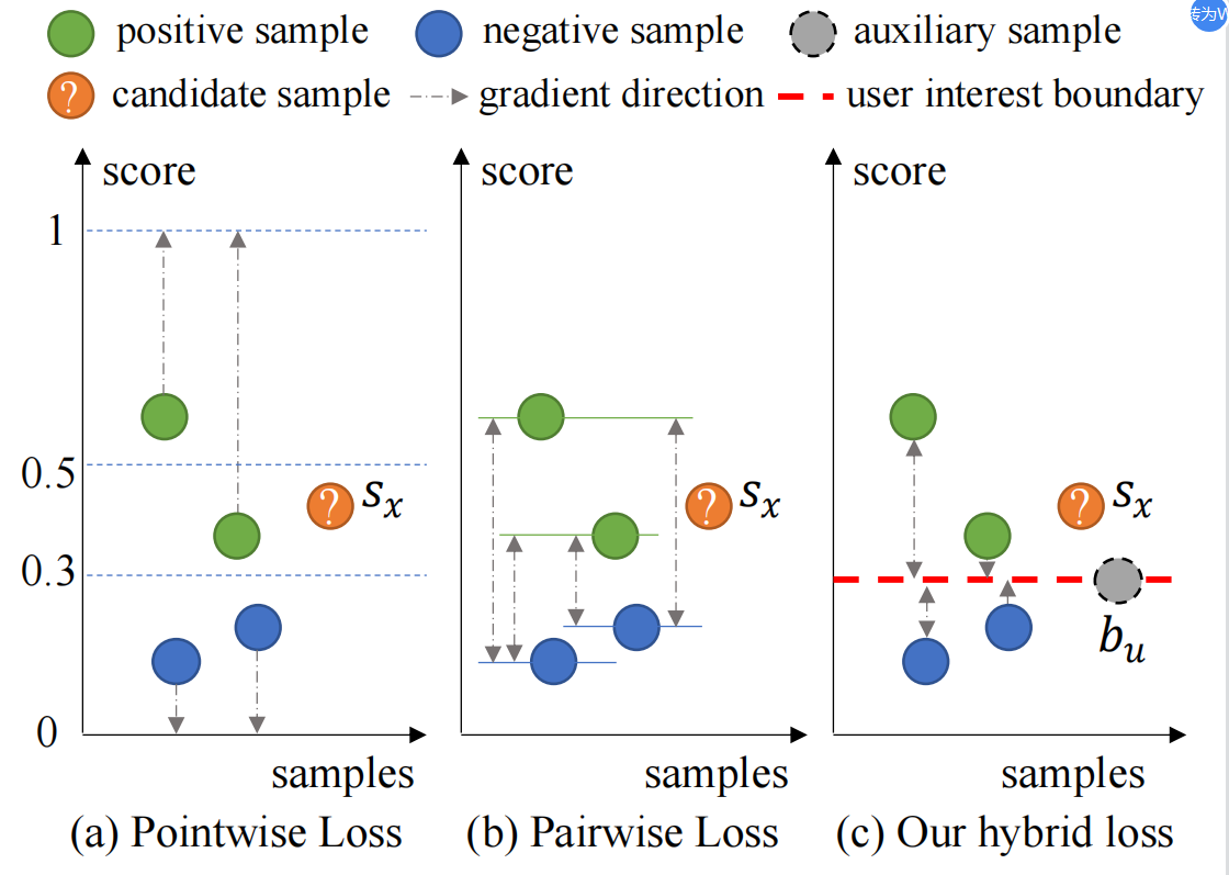 论文概述:推荐系统建模的核心目标是最大化正样本分数s_p和最小化负样本分数s_n,这通常可以概括为两种范式:逐点和成对范式。逐点范式将每个样本分别与其标签相匹配,这在实例级别的加权和采样方面具有灵活性,但忽略了固有的排序特性。通过定性地最小化相对分数s_n-s_p,成对范式能自然地捕获样本的排序,但也存在训练效率低的问题。此外,这两种范式都很难明确提供个性化的决策边界,以确定用户是否对未交互的物品感兴趣。为了解决这些问题,我们创新性地为每个用户引入了一个辅助分数b_u来表示用户兴趣边界(UIB),并使用成对范式分别惩罚跨越边界的样本,即分数低于b_u的正样本和分数高于b_u的负样本。通过这种方式,我们的方法成功地实现了逐点范式和成对范式的混合损失,从而将两者的优点结合起来。分析表明,该方法不需要任何特殊的抽样策略,可以提供个性化的决策边界,显著提高训练效率。大量实验表明,我们的方法不仅在经典的逐点或成对模型上,而且在具有复杂损失函数和复杂特征编码的最新模型上都取得了显著的改进。