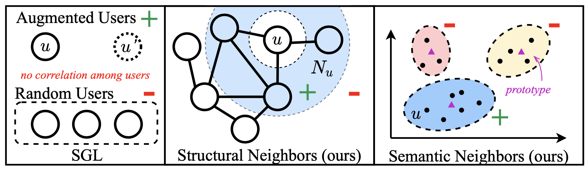论文概述:在推荐系统的研究中,图协同过滤方法试图将用户和物品之间的交互建模为二部图,但实际场景中存在的数据稀疏问题对这类方法影响较大。最近对比学习被应用于图协同过滤方法上来缓解数据的稀疏性,然而这些方法通过随机扰动来构建对比目标,忽略了推荐场景下广泛存在的用户(或商品)之间的邻居关系,未能充分发挥对比学习应用于推荐时的潜力。为了解决上述问题,我们提出了一种新颖的对比学习范式 NCL,它显式地将潜在的邻居关系构造为对比目标。具体来说,我们分别从图结构和语义空间中引入用户(或商品)的邻居。对于二部图上的结构邻居,我们将GNN不同层的输出分别视为节点自身的表示及其结构邻居表示来构建对比目标。此外,为了挖掘语义空间中潜在的邻居关系,我们假设具有相似表示的用户是语义空间中的邻居,并将其纳入原型对比目标。在五个公共数据集上进行的大量实验证明了所提出方法的有效性。