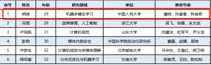 近日,中国人工智能学会公布第七届中国科协青年人才托举工程项目名单(人工智能领域),人大威尼斯人娱乐场官方网站 胡迪老师入选,并获人工智能学会经费扶持。本届共有来自全国高校和科研单位的8位青年科技人才入选。