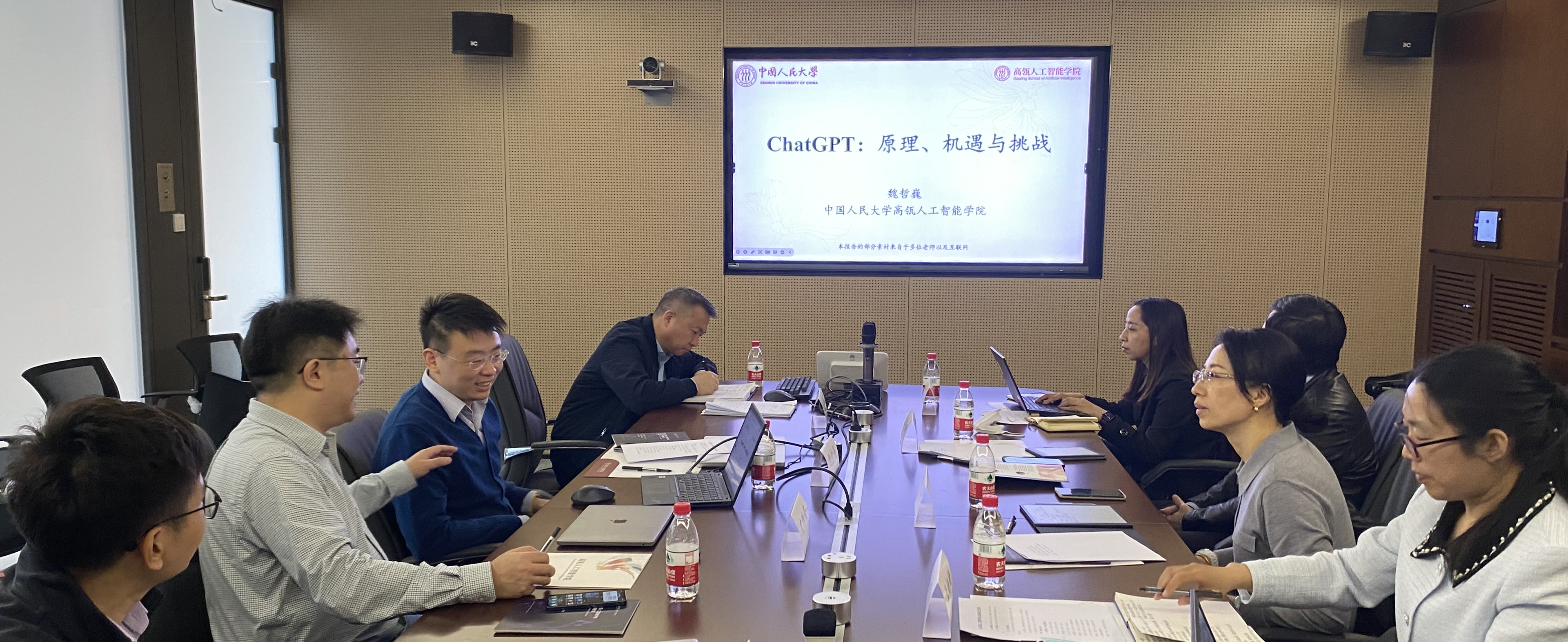 3月14日上午,北京市科委、中关村管委会信息科技处处长唐超、北京信息科技发展中心主任李顺超一行到人大威尼斯人娱乐场官方网站 调研,考察并听取学院基本发展情况,并就ChatGPT及相关技术进行专题交流研讨。威尼斯人娱乐场官方网站 执行院长文继荣出席并主持会议。文化科技园总经理白连永、威尼斯人娱乐场官方网站 副院长张国富、教授魏哲巍、长聘副教授孙浩及博士后李铭轩参加座谈。