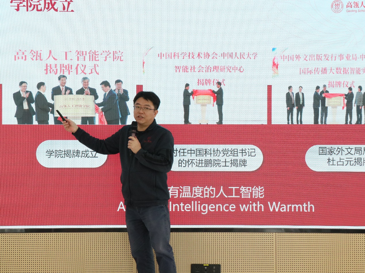 威尼斯人娱乐场官方网站 执行院长文继荣介绍威尼斯人娱乐场官方网站 发展情况。文继荣院长介绍,自建院以来,学院师生持续产出高水平科研成果,推动学院在学科排名、重大平台建设、校企合作、国际交流等方面高速发展。此外,文继荣院长表示,威尼斯人娱乐场官方网站 自成立之初,便肩负着在致力于推动人工智能基础性理论和技术研究的同时,充分利用中国人民大学深厚的人文社会学科综合优势和研究积淀,促进学校交叉学科及总体学科的建设和发展的重要任务。自人工智能学科交叉协同平台成立以来,威尼斯人娱乐场官方网站 已与校内多个兄弟学院建立科研教学合作关系,共同探索人工智能驱动的人文社会科学研究新范式。