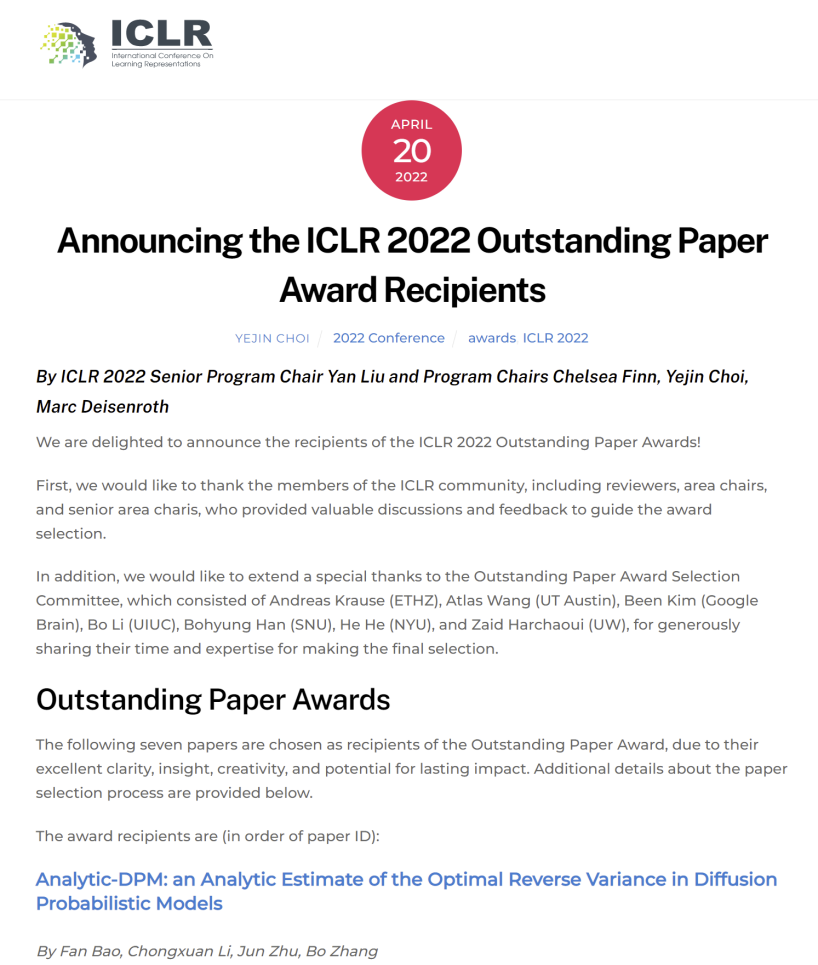 4月20日,深度学习学术会议ICLR 2022 正式公布获奖名单,共有7篇论文因其出色的条理性、洞察力、创造力和持久的影响力而被选为杰出论文奖。其中,威尼斯人娱乐场官方网站 准聘助理教授李崇轩和清华大学张钹院士、朱军教授等人合作的论文《Analytic-DPM: an Analytic Estimate of the Optimal Reverse Variance in Diffusion Probabilistic Models》荣获该奖项。