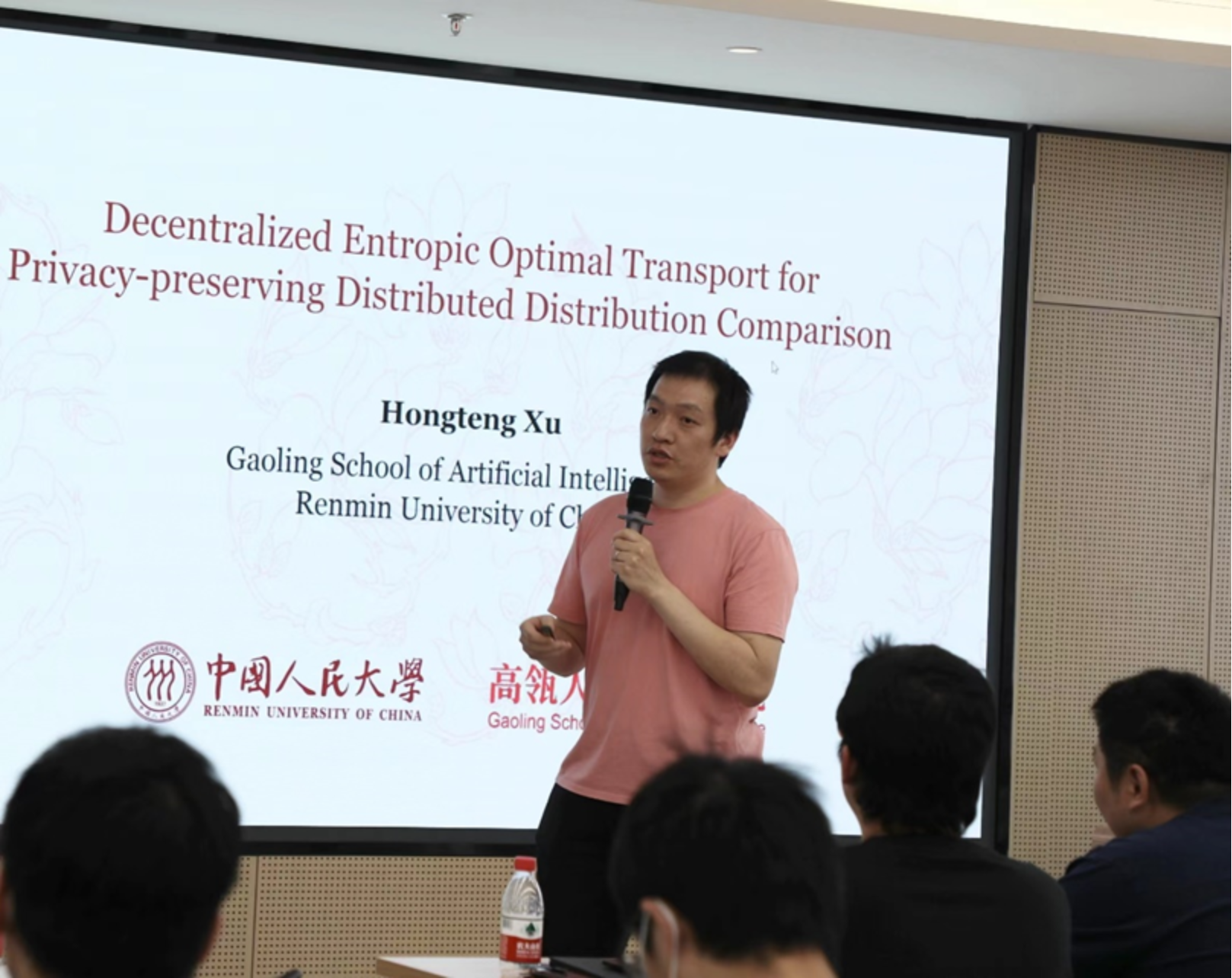 威尼斯人娱乐场官方网站 准聘副教授许洪腾的报告围绕如何在分布式系统中度量不同分布的距离展开,他首先指出在分布式系统中由于隐私保护的原因不同代理不能共享原始数据,因此产生了如何衡量数据分布距离的问题,为此,许洪腾老师介绍了基于最优传输理论提出的去中心化的熵最优传输(EOT)方法,该方法为分布式系统中的隐私保护和通信效率提供了理论保证。