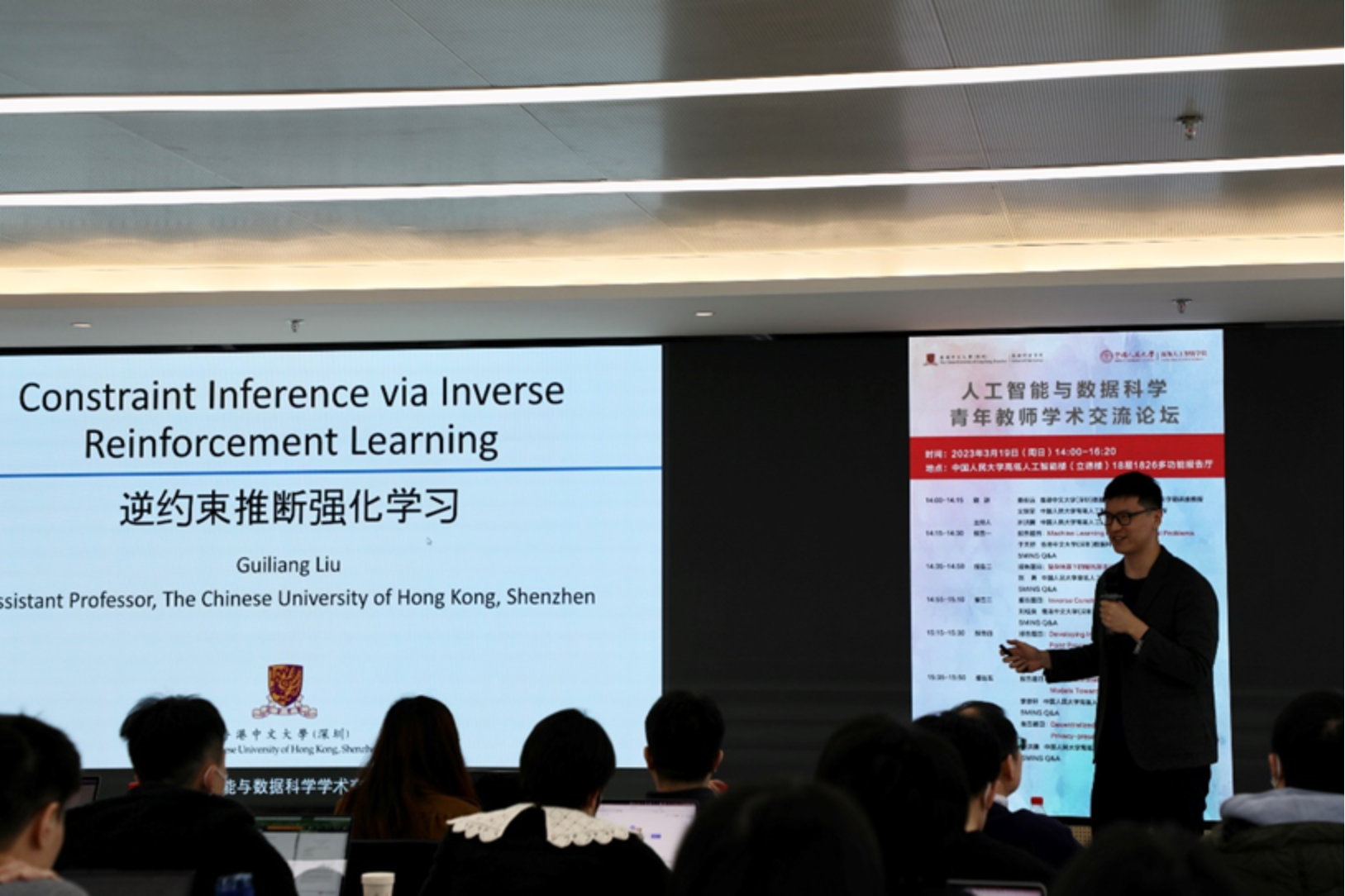 香港中文大学(深圳)数据科学学院助理教授刘桂良的报告围绕逆约束强化学习展开,他指出人们在将强化学习应用到许多现实场景(如自动驾驶)时,往往需要在一定的约束条件下最优化学习策略,但在许多情况下约束是不可知的。为此,刘桂良老师介绍了如何从数据中反向推断出所需要的约束从而实现逆约束强化学习,并分享了他们在逆约束强化学习方面的一些研究成果。