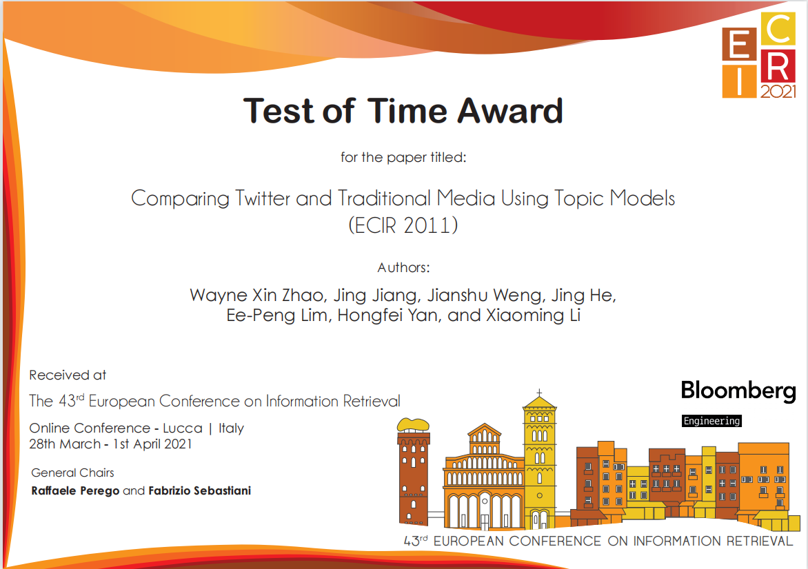 四、赵鑫教授获ECIR’21时间检验奖(Test of Time Award),窦志成教授获CCIR 2021最佳论文奖