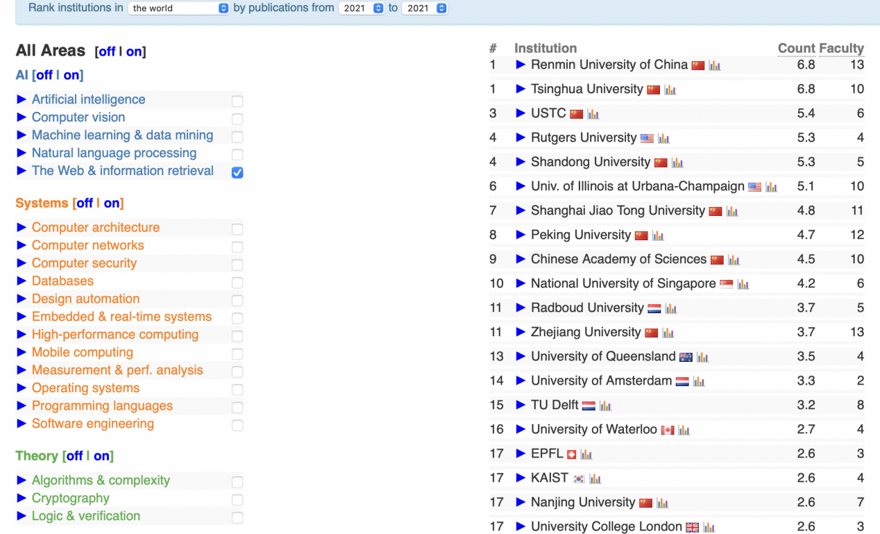 在CSRankings排行榜中,2021年中国人民大学人工智能领域世界排名已提升至第16位,在互联网与信息检索方向排名位居世界第一。