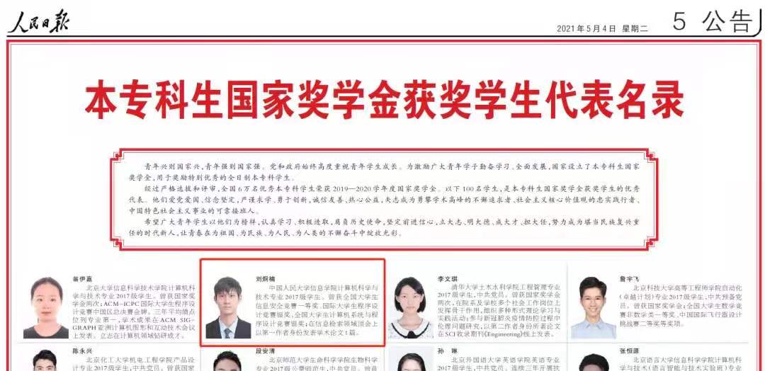 文继荣、窦志成教授指导的研究生姚菁获本学年吴玉章奖学金(全校仅评选10人/年),文继荣教授指导的博士生牛玉磊获中国计算机学会优秀博士论文奖(全国仅评选10人/年),魏哲巍教授指导的直博生王涵之、卢志武教授指导的硕士毕业生丁明宇分别获得百度奖学金(全球仅评选10人/年),窦志成教授指导的学生刘炯楠作为国家奖学金获奖代表登上《人民日报》。