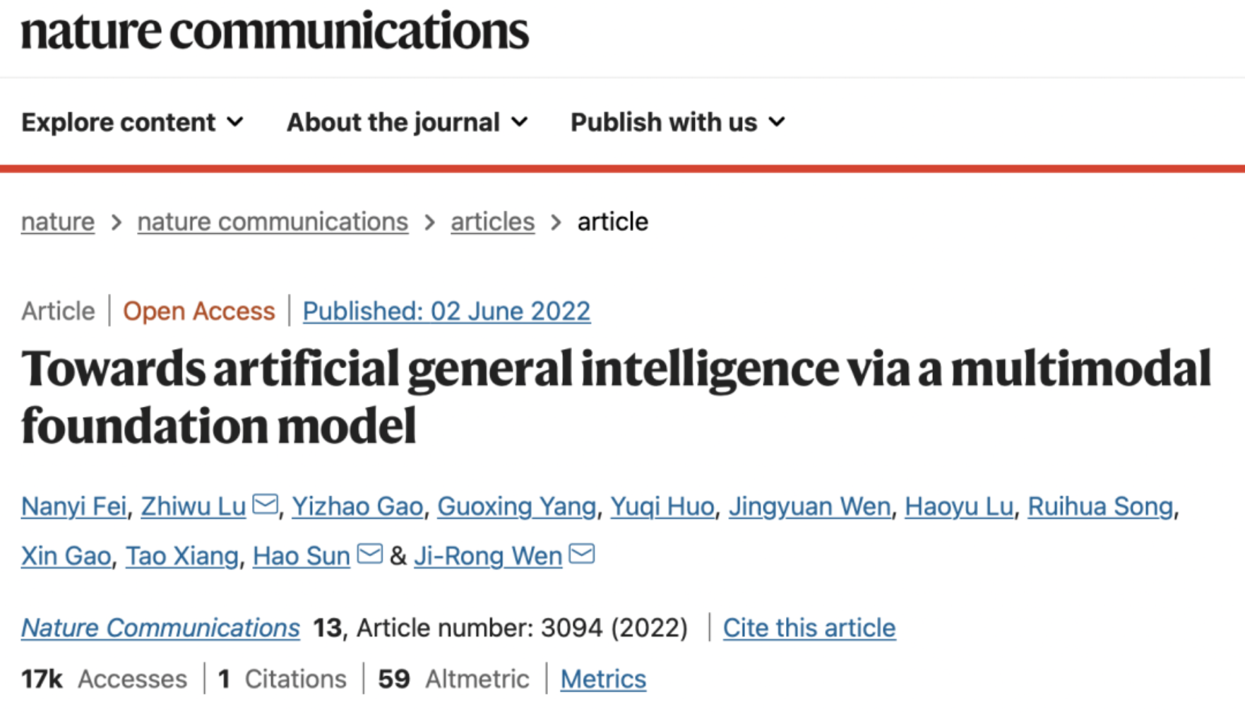党的二十大报告指出,“创新是第一动力”。今年6月,由文继荣牵头的“文澜”团队论文“Towards Artificial General Intelligence via a Multimodal Foundation Model”登上Nature 子刊《自然·通讯》。团队成员通过“观察”人类大脑处理多模态信息的机制,提出文本与图片之间的弱语义相关假设,赋予了模型足够的想象能力和泛化能力,从而帮助人工智能应用快速有效应对各类认知任务。“(纯粹)多模态工作登上 Nature 子刊,在业界尚属首次,这是大模型项目力争世界领先的努力成果,也是多模态迈向通用人工智能这一研究方向的重要进展。”对于该工作的意义,威尼斯人娱乐场官方网站 教授卢志武如此介绍。