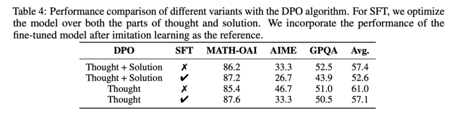 当同时使用 Thought 和 Solution 时,SFT 损失对优化似乎没有正面影响,这可能是因为解决方案已经在 DPO 训练过程中得到了整合。