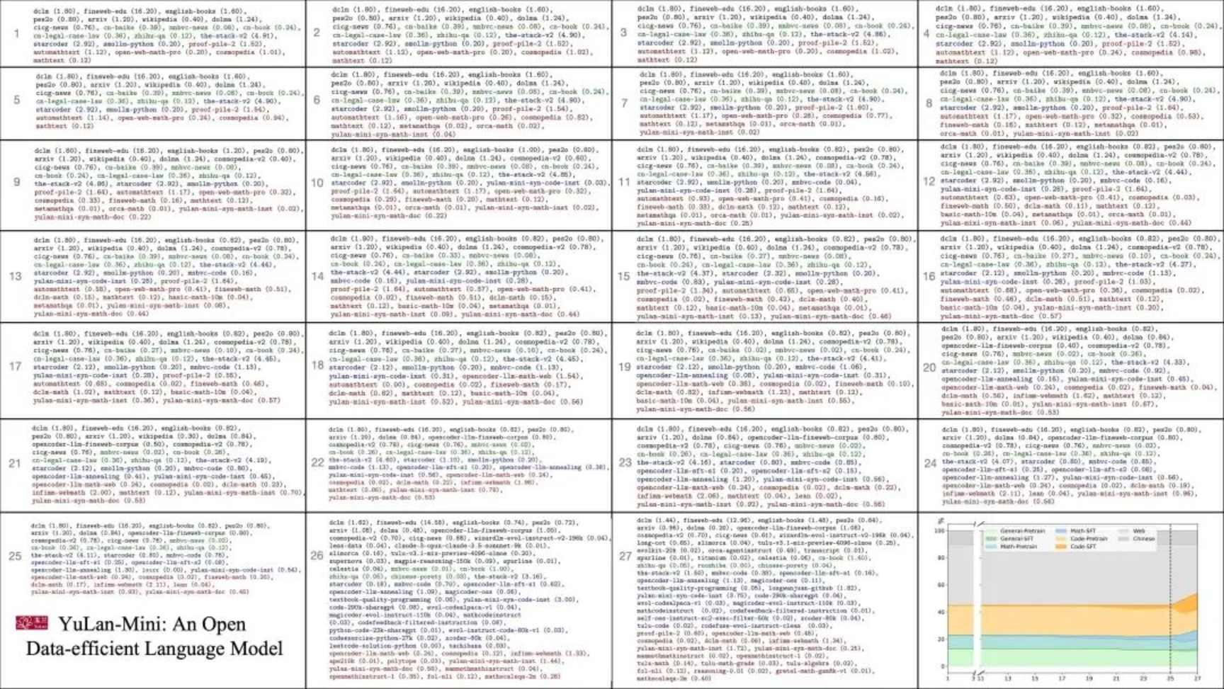为了确保完整可复现性,我们公布了逐阶段的具体数据配比。下图的高清版本以及带有完整细节的列表会公布在 GitHub 主页,便于开源社区训练模型,以及后续研究者在数据课程和退火数据选择上展开研究。//github.com/RUC-GSAI/YuLan-Mini