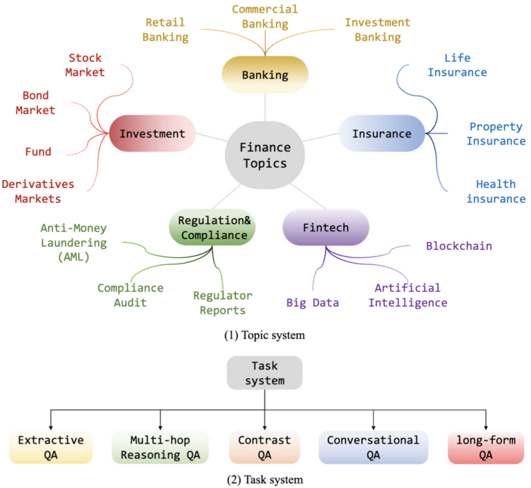 图2:用于构建基准的主题树。包含商业银行业务、股票市场、人寿保险、银行业、债券、财产保险、投资基金、金融衍生品市场、健康保险、监管与合规、反洗钱(AML)、金融科技、区块链、大数据人工智能、合规、监管报告等16个金融主题。