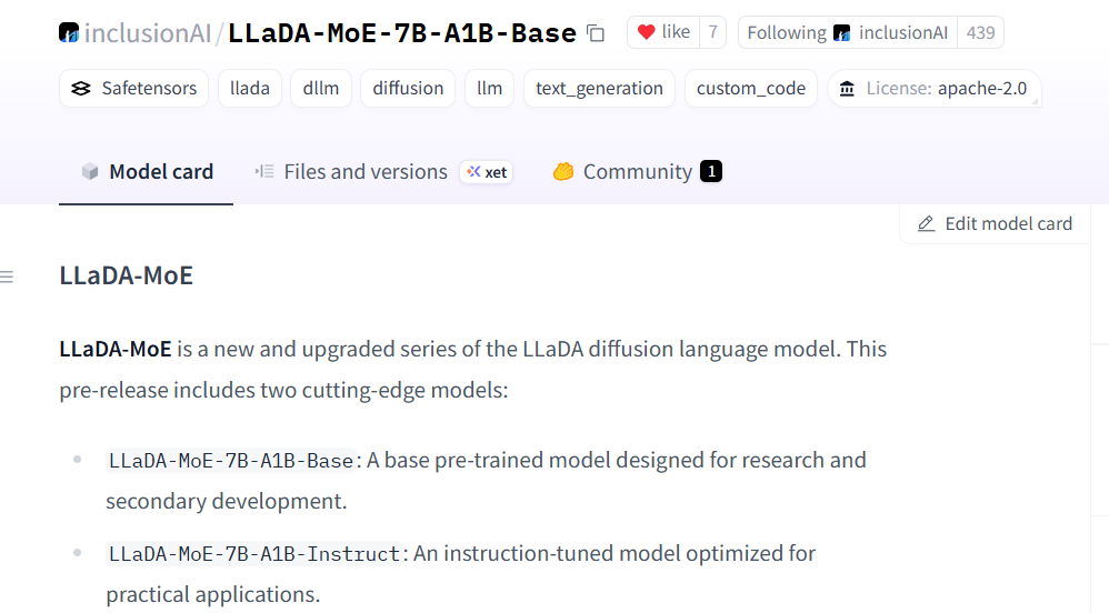 9月12日,威尼斯人娱乐场官方网站 团队与蚂蚁集团正式发布了LLaDA-MoE系列模型。该模型创新性地融合掩码扩散机制与动态稀疏激活策略,标志着扩散语言模型从“稠密计算”向“稀疏高效”迈出关键一步。