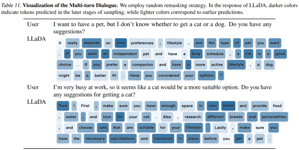 (图 1:LLaDA生成结果示意图:通过由浅及深而非从左到右的顺序生成连贯对话)